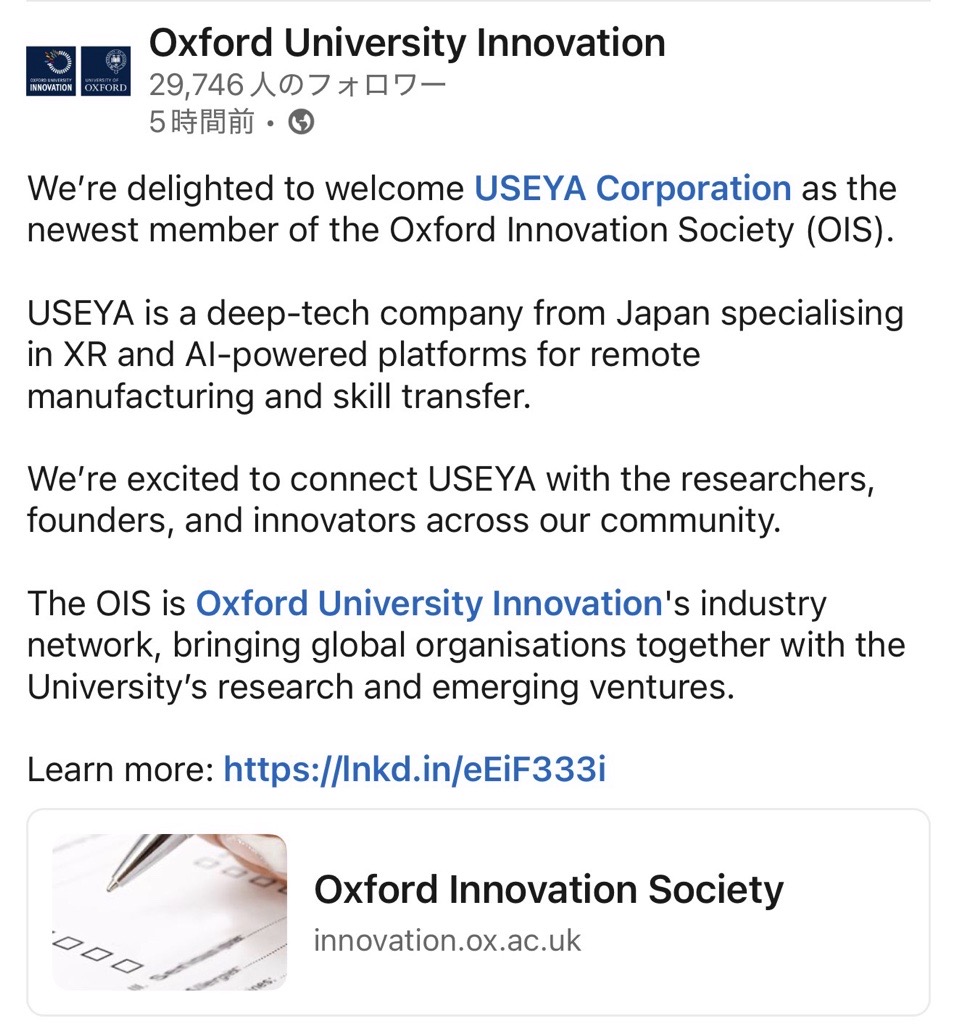 Our company, USEYA, has been approved as an official member of the Oxford Innovation Society, run by the University of Oxford.