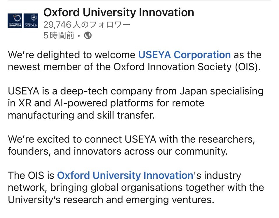 Our company, USEYA, has been approved as an official member of the Oxford Innovation Society, run by the University of Oxford.